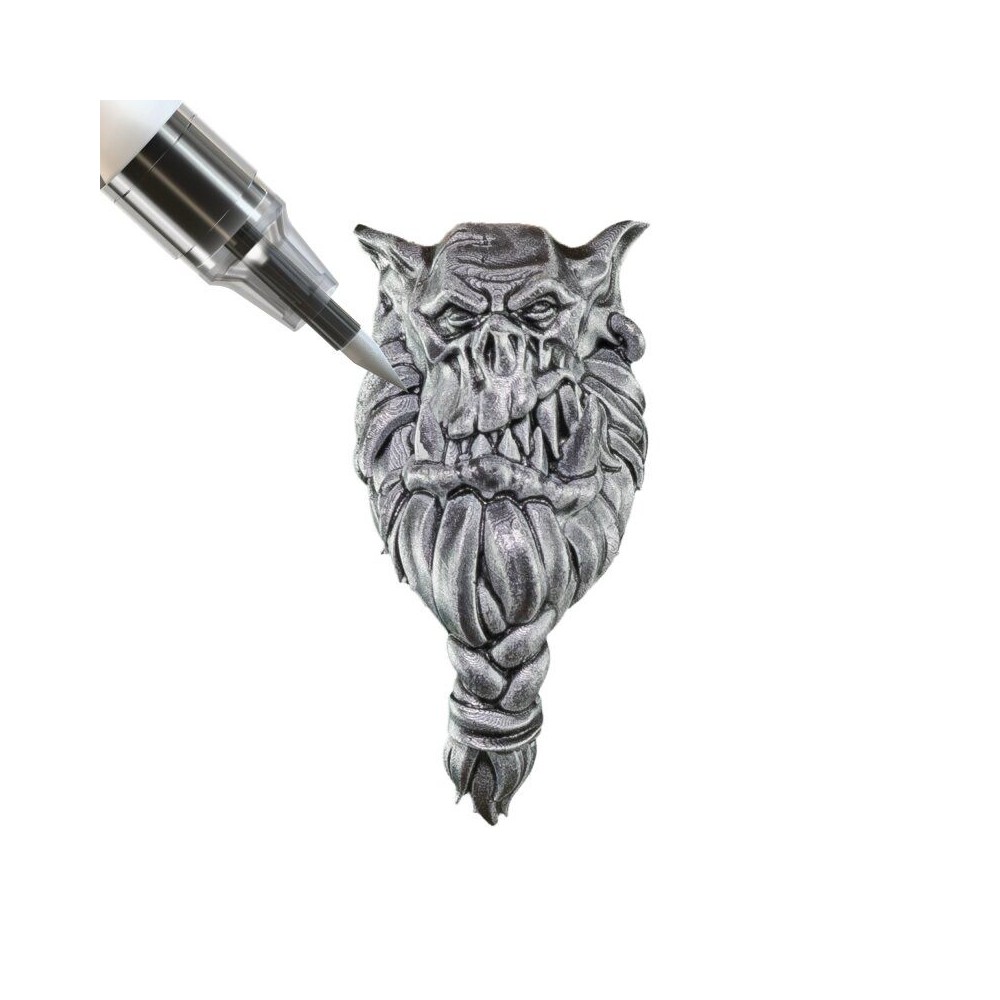 Brilliant metallic silver for weapons, armour, and mechanical details. Metallic pigment stays consistent from first stroke to last.