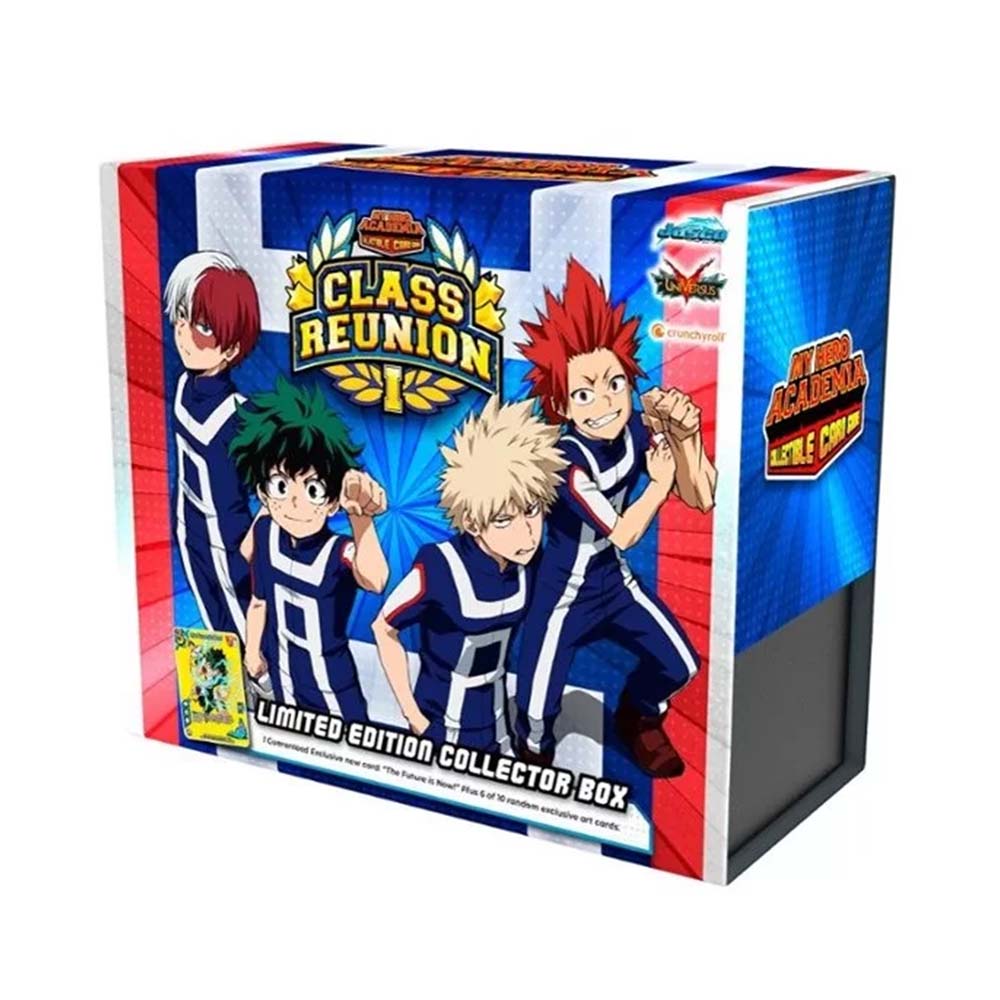 Celebrate our one year anniversary of the My Hero Academia Collectible Card Game Class Reunion! The Class Reunion Collector Box introduces 11 brand new cards to the game. Collect these cards in gorgeous foil! Each Deluxe Collector Box contains 6 random foil cards from a set of 10 alongside 1 guaranteed new foil card; “the future is now!”, 8 My Hero Academia: Set 4 League of Villains booster packs, and a plethora of premium level gaming aids! The perfect gift for collectors and players alike!