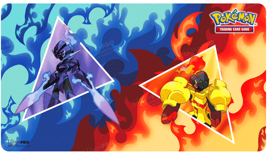 Playmats for Pokémon feature vibrant, full-color artwork of Armarouge and Ceruledge. Made with a soft fabric top to reduce damage to cards during play and a non-slip rubber backing to keep the playmat from shifting during use, playmats enhance the gameplay experience. With dimensions of approximately 24 in. x 13.5 in., a playmat also makes an excellent oversize mousepad for home or office.