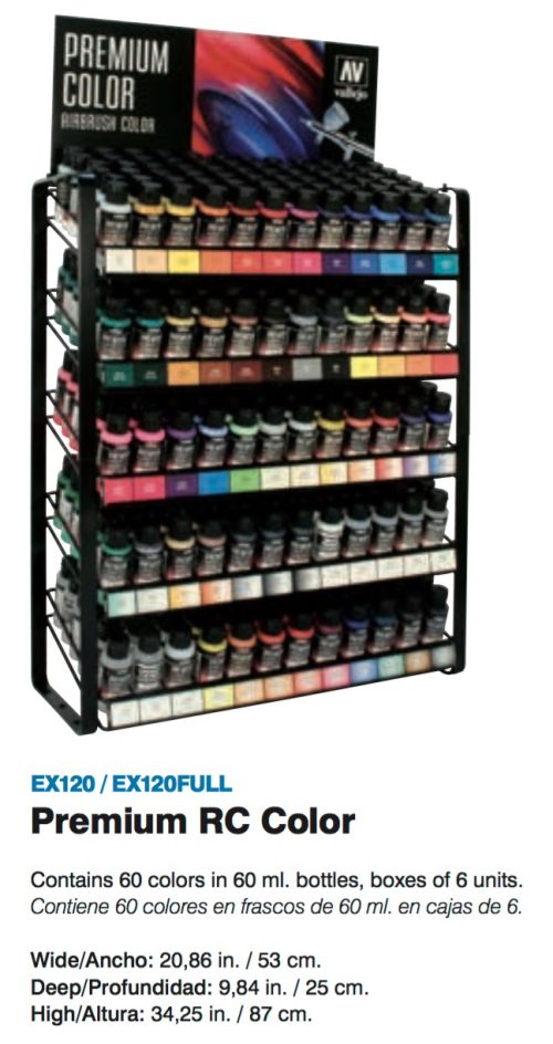 Contains Game Color, Xpress Color and Game Air complete ranges Black metal floor length display, divided in two sections, allows the addition of wheels. Width: 26,26 in / 66,7 cm Depth: 9,05 in / 23 cm Height: 80,70 in / 205 cmFor a complete list of products available on Vallejo racks please click here.